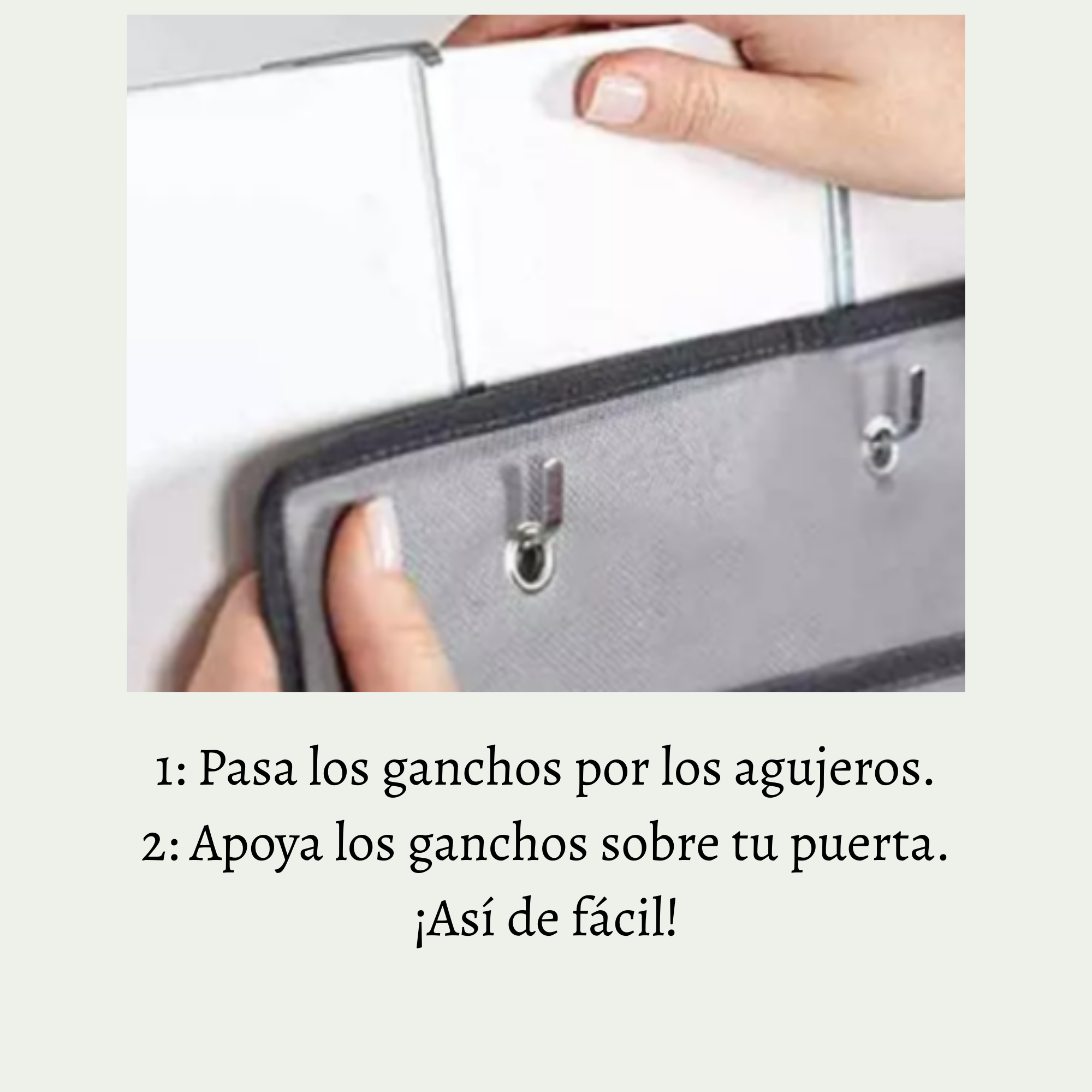 El organizador mide 1,60 cm de alto por 68 cm de ancho, y su sistema de sujeción es sencillo, basta con colocar los 3 ganchos sujetables a la puerta, los cuales tienen una tolerancia de hasta 5 cm de ancho, y así poder adaptarse a cualquier tipo de puerta.